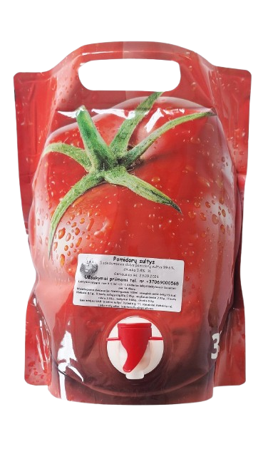 Sudedamosios dalys: pomidorų sultys 99.6%, druska 0.4%. 3 l.